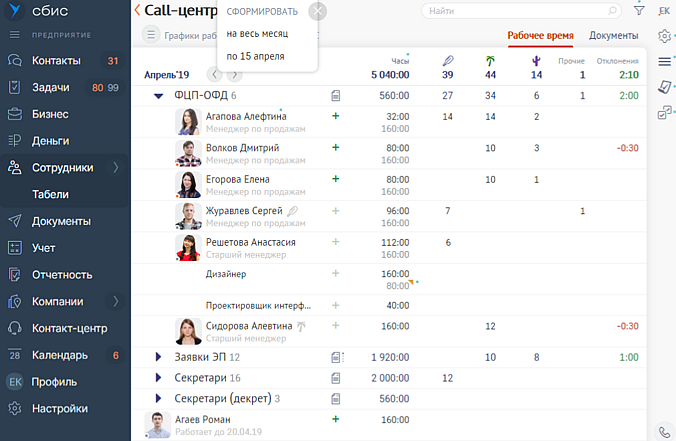 Например, если нужно выдать аванс в середине месяца, внесите данные в табель за период с начала месяца до даты аванса. Кадровик проверит в отчетах время работы по каждому сотруднику, переработки, отгулы, больничные и отпуска. А руководитель согласует табель, если нет ошибок.