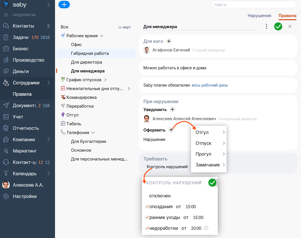 Перейдите в раздел «Правила работы», чтобы задать условия контроля. Настраивайте допустимое время опоздания, раннего ухода или недоработки и выбирайте, что нужно сделать в случае нарушения.