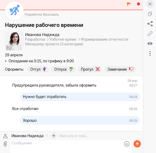 Если хотите вручную выбирать меру, включите настройку «Уведомить» в блоке «При нарушении» в разделе «Правила работы». Например, сотрудник опоздал. Прямо в карточке уведомления он объясняет причину. А вы решаете, что делать: оформить отгул или зафиксировать замечание, если повод неуважительный.