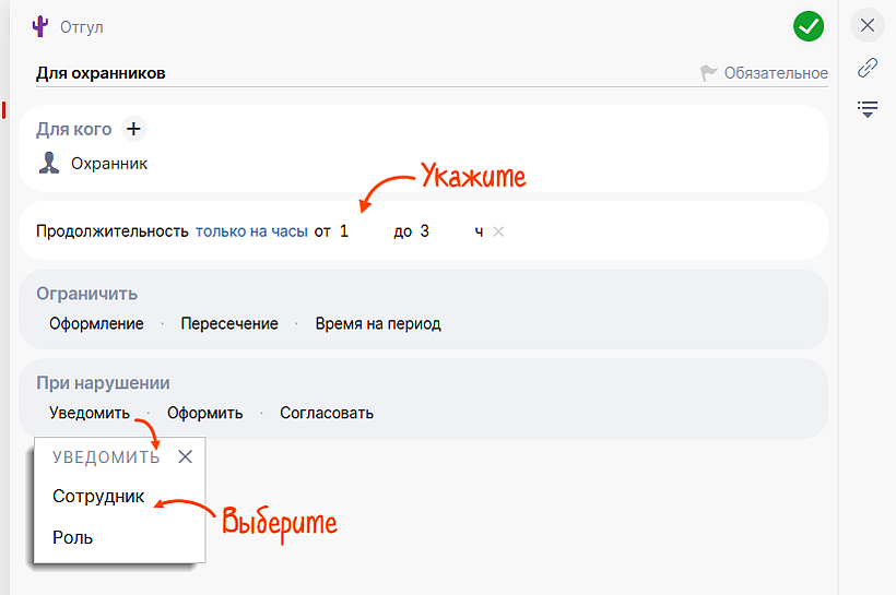 Устанавливайте допустимую продолжительность отгула, например, для охранников не более 3 часов. Если сотрудник превысит разрешенное время, система зафиксирует нарушение и уведомит руководителя.