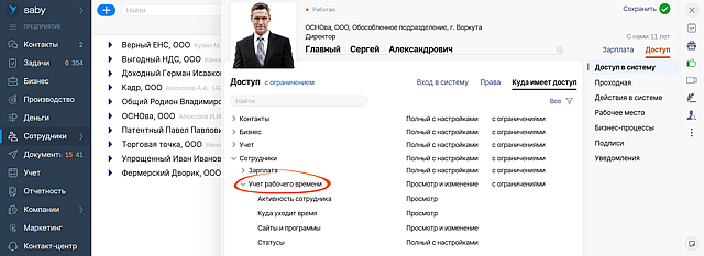 Активность сотрудника. Объединили данные в одном окне: здесь теперь настраивается доступ к активности, IP-адресам, фото с рабочих мест и проходной.