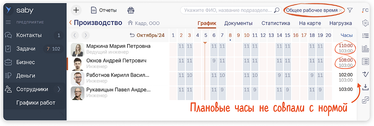 Задайте суммированный график с нужным периодом учета и распределите смены. Saby сам сравнит запланированное время с нормой периода учета. При составлении графика включите фильтр «Общее рабочее время». Вы сразу увидите разницу между плановыми часами и нормой производственного календаря. Saby покажет норму, даже если сотрудник работает на индивидуальных условиях: неполной ставке или условиях сокращенного рабочего времени. Вы легко подкорректируете нагрузку, если будут расхождения.