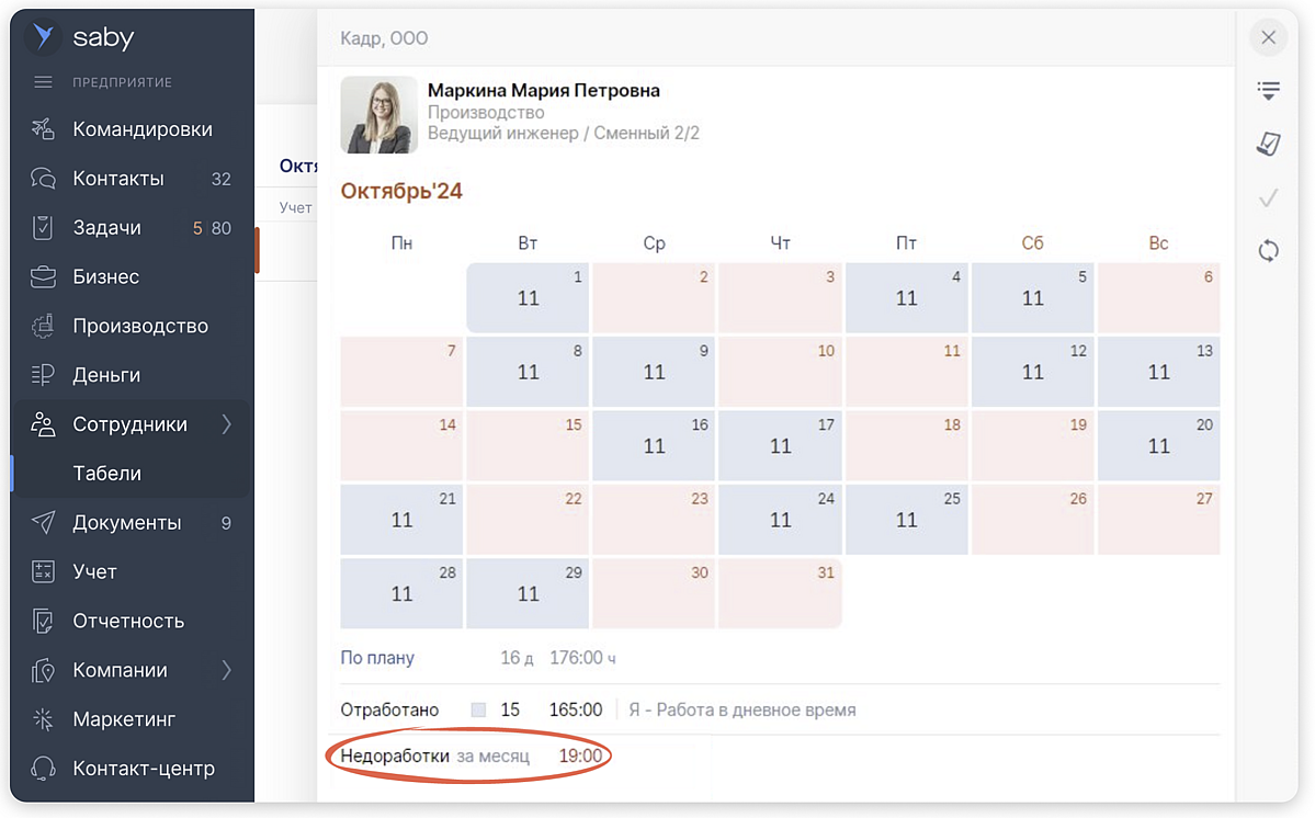 Если сотрудник отработал часы, запланированные по суммированному учету, но это время отличается от нормы производственного календаря, Saby автоматически отразит отклонения, которые работодатель обязан оплатить.