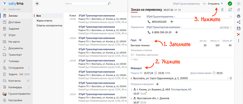 Выбирайте перевозчика, с которым необходимо согласовать заказ. Заполняйте характеристики груза: количество грузовых мест, габариты, объем, состояние, вид тары, любые дополнительные параметры и признак опасного груза. Указывайте маршрут движения транспорта и отправляйте документ перевозчику. После утверждения заказа в один клик создавайте ЭТрН. Saby перенесет все данные в документ.