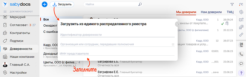 При работе в Saby: если вам надо загрузить доверенность из реестра ФНС, укажите ИНН представителя. ИНН можно будет ввести вручную или выбрать из справочника сотрудников либо организаций. Ранее зарегистрированные доверенности продолжат работать, дополнительно ничего делать с ними не нужно.