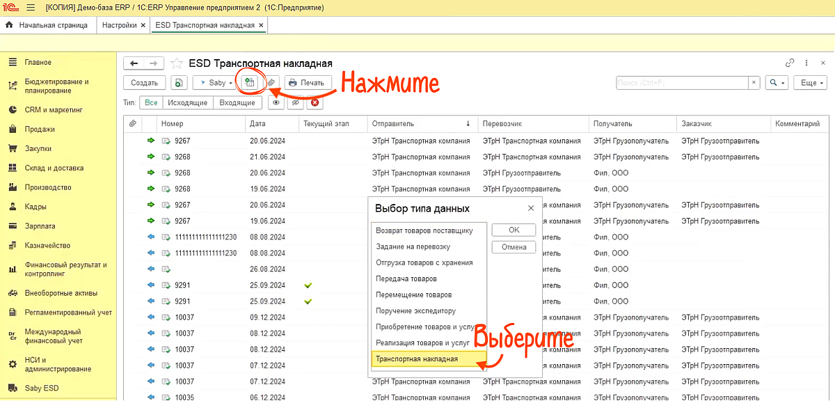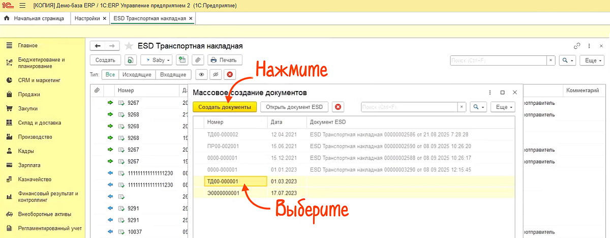 В разделах ЭТрН, ЭПЛ или «Заказы на перевозку» в панели массовой обработки выберите документ-основание и нажатием одной кнопки сформируйте все ЭПД разом.