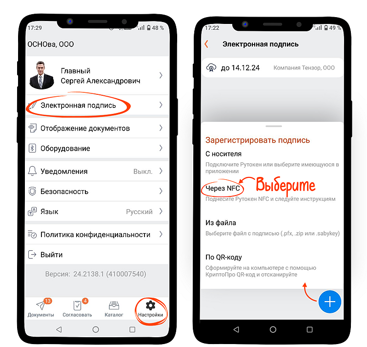 Откройте приложение и зайдите в «Настройки/Электронная подпись».