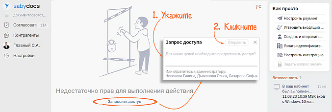 Просто кликните «Запросить доступ» в сообщении об ошибке. Администратор обработает запрос — и вы сможете работать с нужным функционалом.