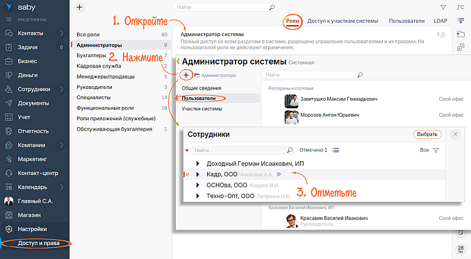 Работаете в СБИС (Saby) с юридической структурой? Теперь выдать права из карточки роли можно сразу всем сотрудникам не только управленческого, но и юридического подразделения.