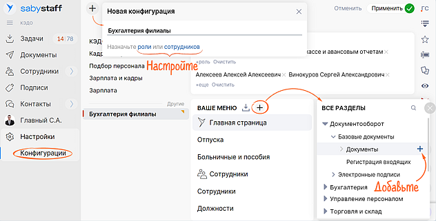 Для групп сотрудников делайте в Saby собственные конфигурации. Перейдите в нужное приложение, создайте конфигурацию, выберите роли или конкретных людей, которые будут иметь к ней доступ. Добавьте разделы, которые будут отображаться в главном меню.