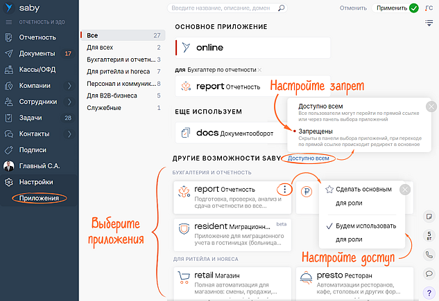 Чтобы сотрудники не заблудились в разных Saby, настройте доступ: