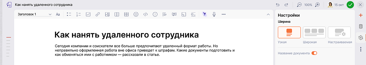 Добавили новые возможности в режим редактирования документов Sabydoc. Стали доступны команды: поделиться ссылкой на документ, скачать его, распечатать или настроить права доступа. Настраивайте ширину полей, как вам удобно. При желании скройте заголовок, чтобы освободить больше места для содержимого.