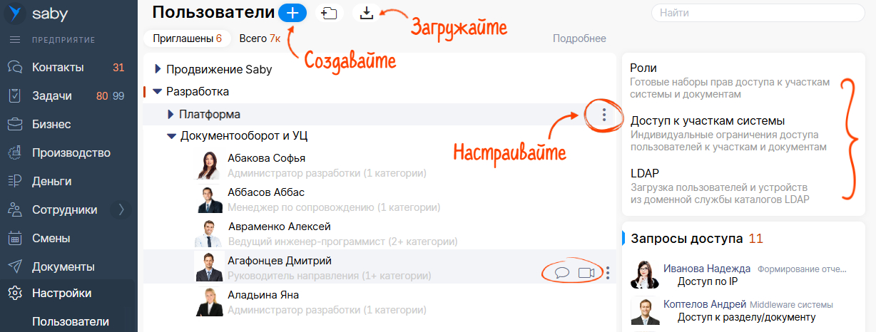 управлять пользователями и подразделениями — создавать, загружать, редактировать, удалять;